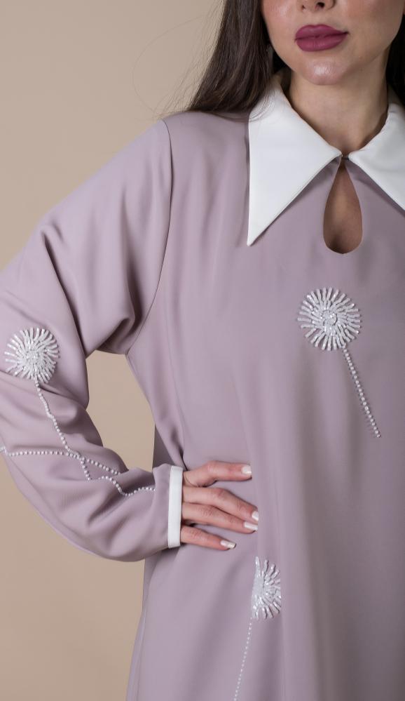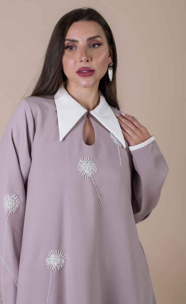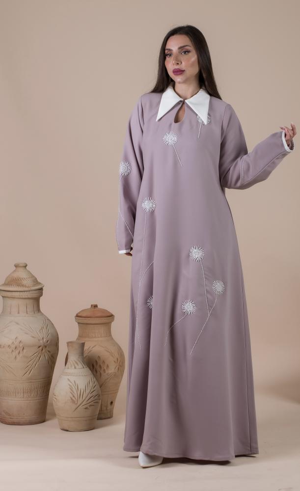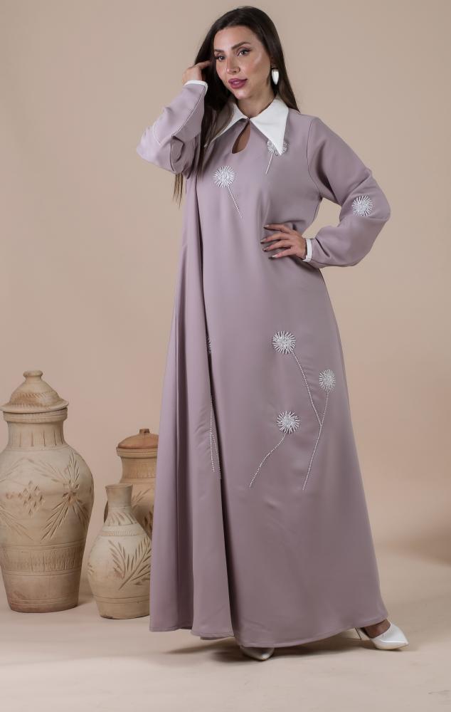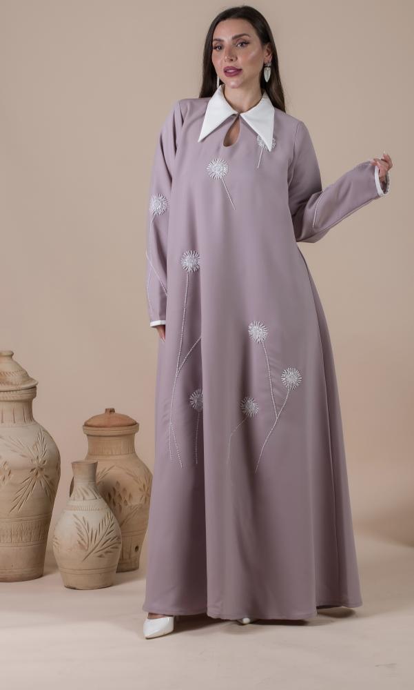 مع جلابية موف ستحصلين على رقة ونعومة في كل تفصيلة ، حيث تجمع بين نعومة القماش وجمال الوردات البيضاء ، لتتألقي بإطلالة رقيقة وجذابة في كل وقت ومناسبة.