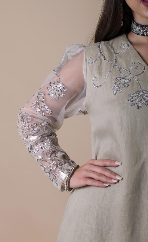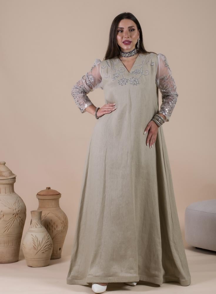 - قماش لينن هندي خفيف الوزن : يتميز بملمس ناعم ولطيف على البشرة، مما يزيد من الراحة أثناء الارتداء.
