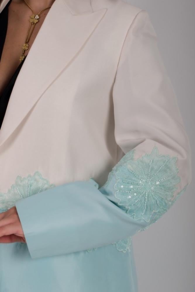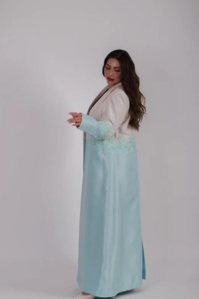 عباية تركواز في بيج لونين متناغمين لإطلالة متكاملة مع تطريز راقي على شكل أزهار بالوسط ، علاوة على ذلك فالقصة بليزر مبطن ناعمة لدفء خيالي وطلة ولا أروع وتتوفر طرحة مناسبة مع العباية لتتجهزي بسهولة لإطلالتك في الاحتفالات.